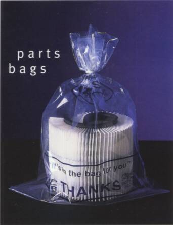 Item # PB-01 - Parts Bag Protect your customers' cars when you transport or return parts in heavy duty bags. See through plastic lets you show and clearly explain where parts were worn or damaged, without any mess. Packaging: 500/roll Weight: 10 lbs.